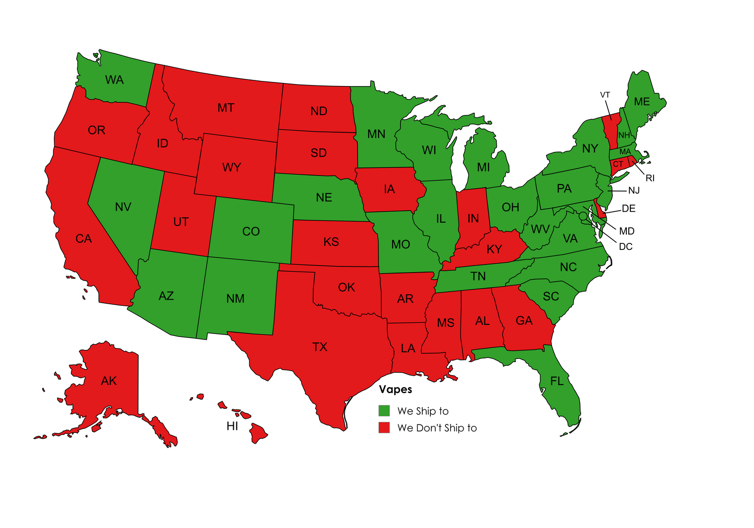 Our products are federally legal under the 2018 Farm Bill. We ship this product to the states in green. Please check out our other products if your state is not on this list.