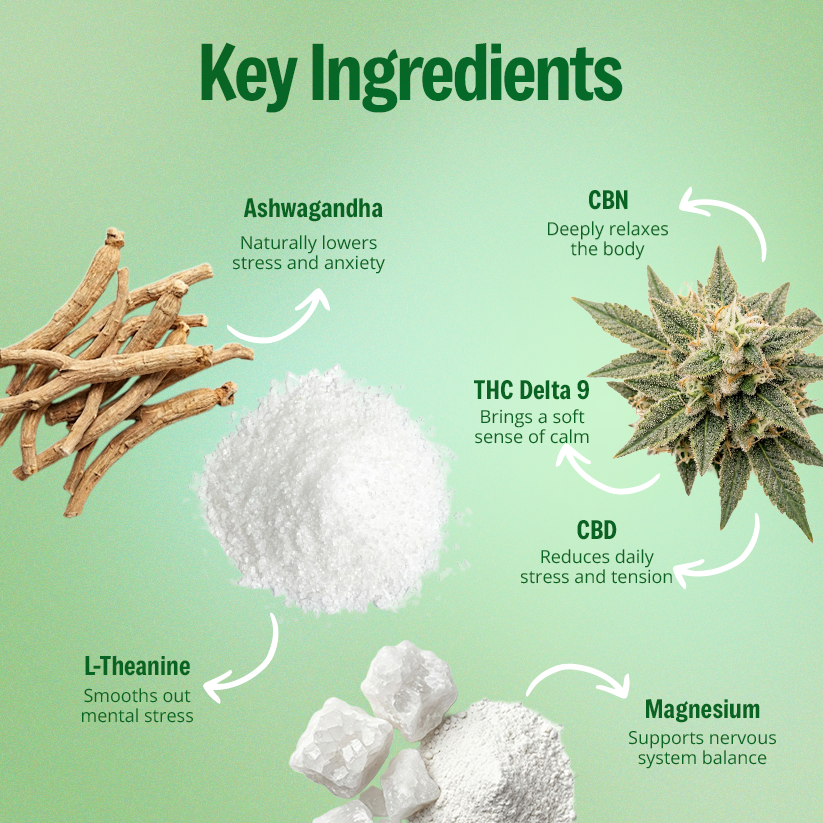 Sugar, Corn Syrup, Water, Peetin, Citric Acid, Sodium Citrate, Malic Acid, MCT Oil, Natural Flavors and Colors, Ashwagandha, L-Theanine, Magnesium, Hemp Extract.